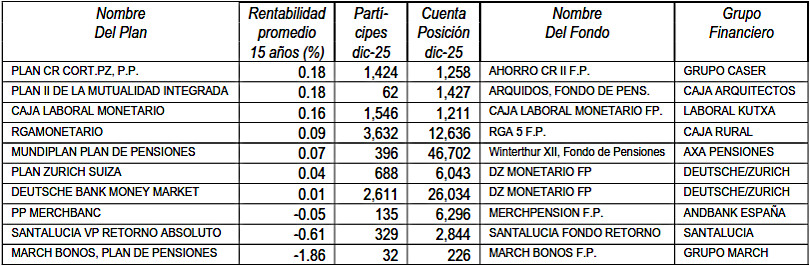 La rentabilidad media de los fondos de pensiones en España en los últimos 15 años (3,23%) fue inferior a la rentabilidad media del IBEX 35 (8,46%) y a la de la inversión en bonos del estado español a 15 años (5,84%). La rentabilidad media del Eurostoxx 50 fue 7,82% y la del S&P fue 14,06%.