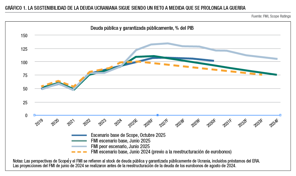Como resultado, la atención se ha desplazado hacia el uso de los activos rusos congelados. Esto garantiza que Rusia pague por la guerra que ha iniciado, aliviando la presión sobre los contribuyentes occidentales. El programa de préstamos Extraordinary Revenue Acceleration (ERA) del G-7, que utiliza los intereses de estas reservas, marcó el inicio de este cambio, pero sus recursos están casi agotados. A menos que sufra una derrota rotunda, es poco probable que Rusia indemnice a Ucrania, por lo que los préstamos con cupón cero concedidos a Ucrania funcionarían efectivamente como subvenciones, minimizando el impacto adverso sobre la sostenibilidad de la deuda pública y la capacidad de reembolso del país (Gráfico). Además, la CE quiere facilitar la prolongación de la inmovilización de los activos congelados por una mayoría cualificada de los Estados miembros de la UE, en lugar de la unanimidad que se requiere actualmente, para evitar posibles vetos futuros que podrían frustrar el programa.
