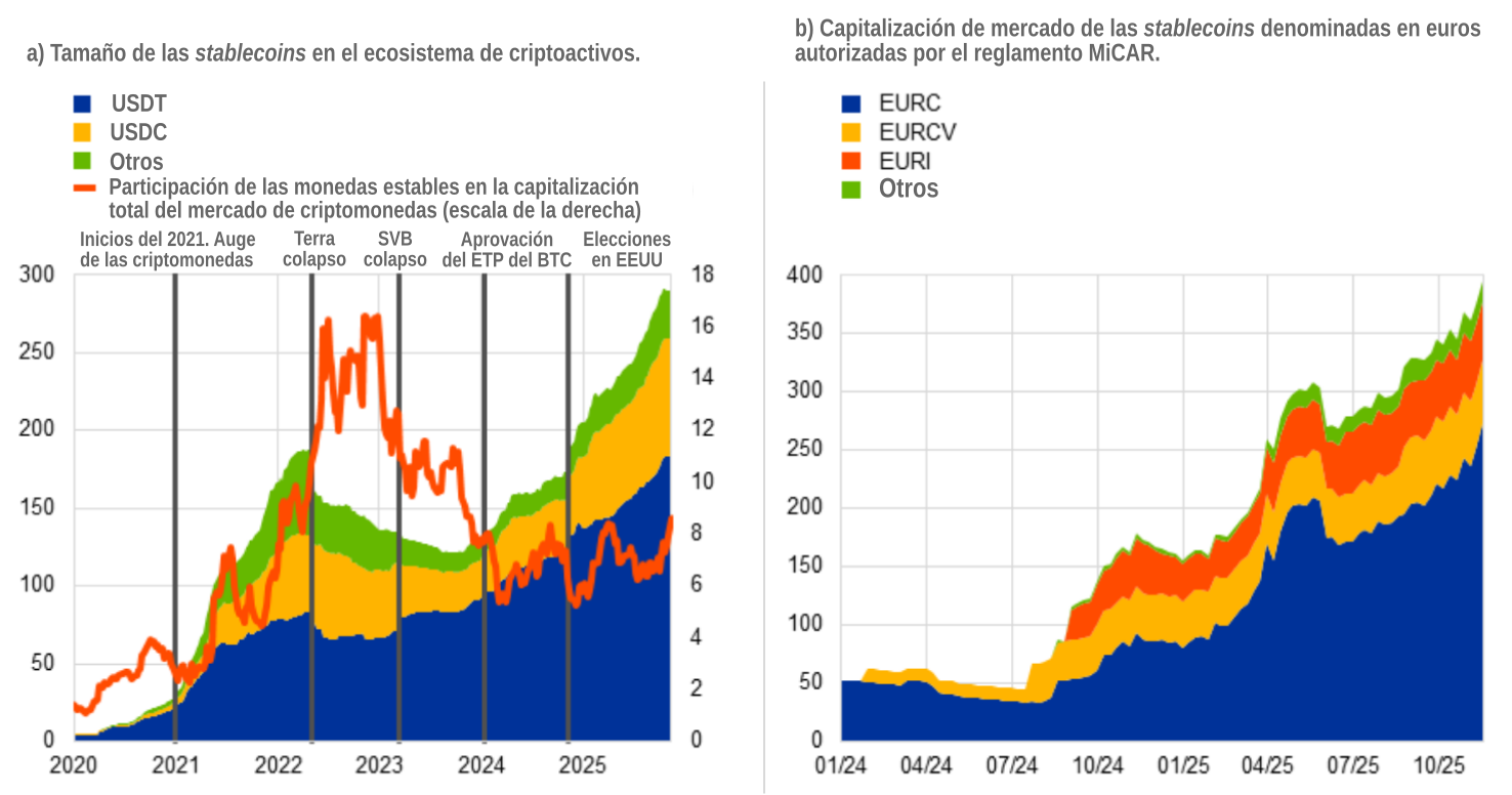 Impulsada por el creciente interés de los inversores y los avances regulatorios globales, la capitalización de mercado combinada de todas las stablecoins ha alcanzado máximos históricos. A noviembre de 2025 superaba ya los 280.000 millones de dólares, lo que representa aproximadamente el 8% del mercado total de criptoactivos (Gráfico A a).