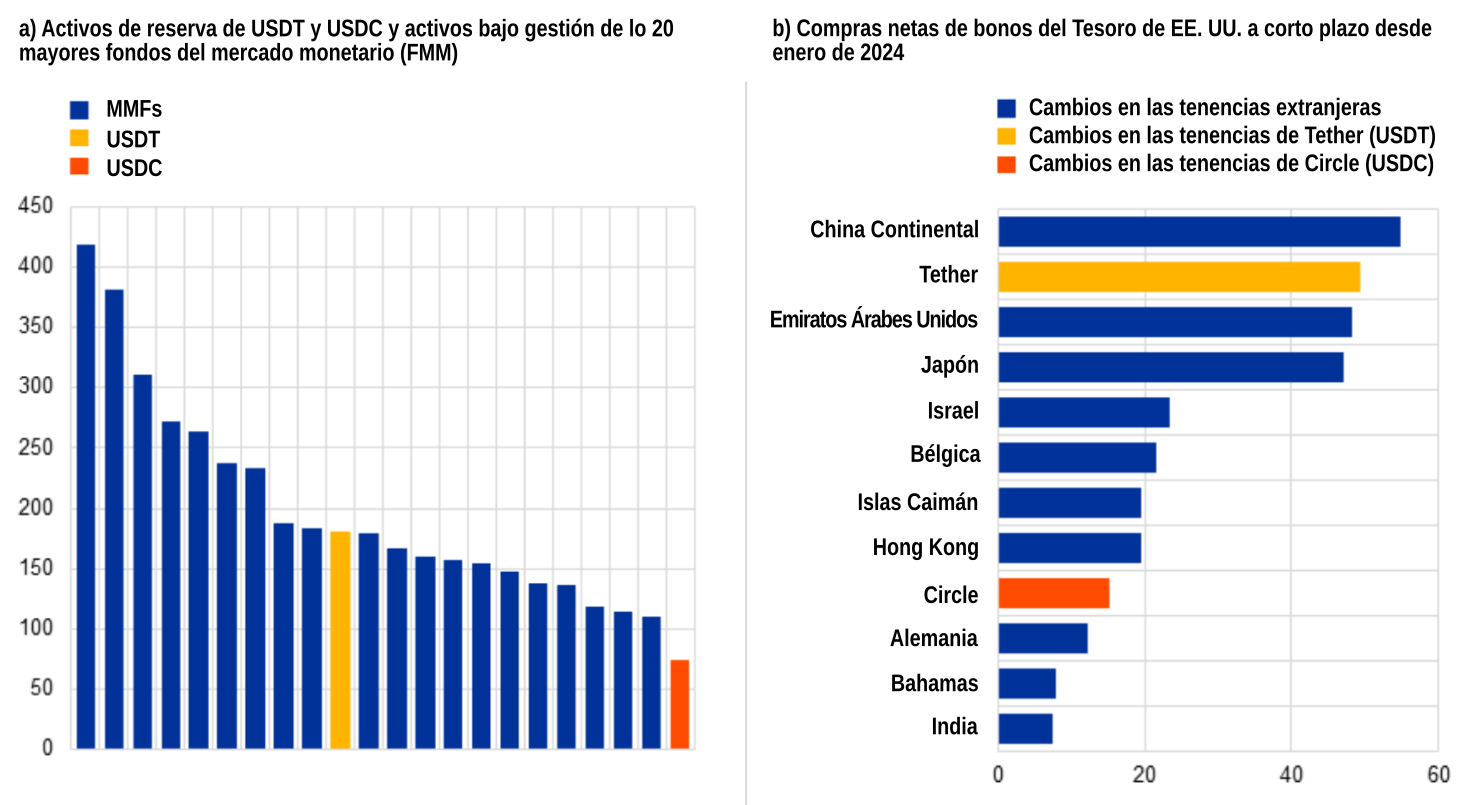 Panel a: Activos netos de los fondos del mercado monetario (FMM) y activos de reserva de Tether (USDT) y USD Coin (USDC) a 30 de septiembre de 2025. Los activos de reserva de USDT y USDC consisten predominantemente en bonos del Tesoro de EE. UU., repos inversos, participaciones en FMM, efectivo y depósitos bancarios.